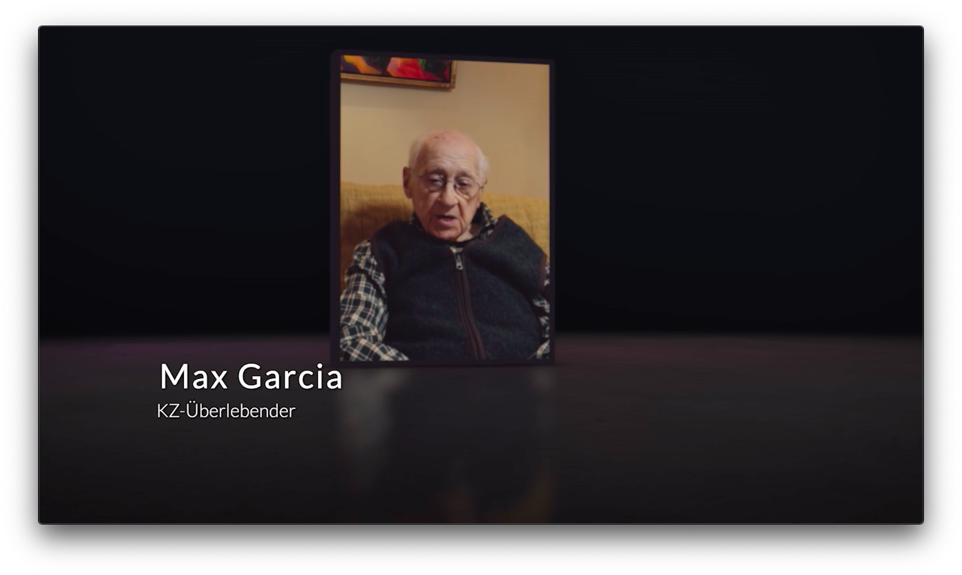 "Hallo, ich bin Max Garcia aus Amsterdam/Niederlanden und ich bin 96 Jahre jung. (Können Sie die Konzentrationslager nennen, in denen sie inhaftiert waren?) Ich war in Westerbork in den Niederlanden, und wurde dann mit dem Zug nach Auschwitz gebracht. Von Auschwitz kam ich nach "Buna". In "Buna" blieb ich 10 Tage und kehrte dann nach Ausschwitz zurück. Von Auschwitz in Polen begab ich mich auf einen Todesmarsch. Todesmarsch – wir wurden aus dem KZ evakuiert und kamen dann nach Mauthausen, Melk und Ebensee, von wo ich befreit wurde."