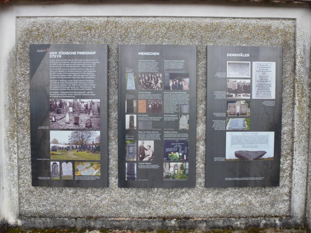 Aus Sicherheitsgründen ist der jüdische Friedhof in Steyr abgeschlossen und nur mit einer Führung zugänglich. Eine dauerhafte Aufsicht während der gesamten Landesausstellung konnte aus finanziellen Gründen nicht realisiert werden. Um den Besucherinnen und Besuchern trotzdem einen Eindruck vom Inneren des Friedhofes zu vermitteln, gestaltete das Mauthausen Komitee Steyr als eigenen Beitrag zur Landesausstellung an der Außen-mauer des Friedhofes drei Stahlplatten, die das Innere des Friedhofes sichtbar machen.