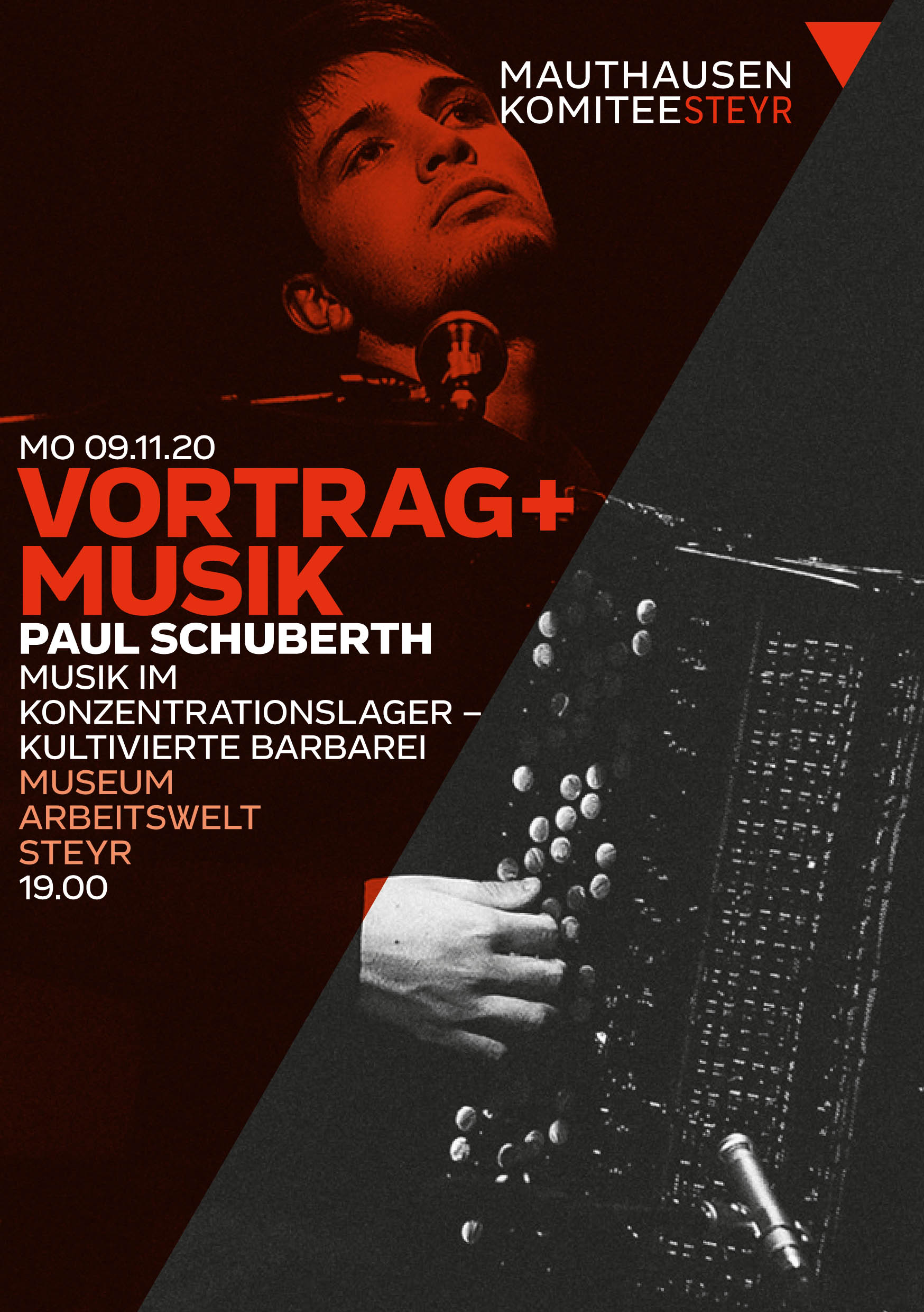 Am selben Abend Montag, 9. November 2020 um 19.00 Uhr spricht der Musiker Paul Schuberth im Museum Arbeitswelt Steyr über Musik im Konzentrationslager und spielt selbst ausgesuchte Stücke. Diese Facette der NS-Geschichte wurde bisher wenig beleuchtet. Viele kennen zwar das Lied "Die Moorsoldaten", aber andere Aspekte blieben weithin unbekannt. In den Händen der SS-Mannschaften geriet Musik zum Folterinstrument, sei es in Form des Zwanges zum Singen, der Beschallung des Lagergeländes mit nationalistischen Liedern oder der musikalischen Untermalung von Exekutionen. Der Vortrag beschäftigt sich auch mit der Rolle der Musik bei der Vernichtung der Häftlinge und als Propagandamittel im Lager. Paul Schuberth stellt auch die Frage, ob nicht die Erinnerung an Musik im Konzentrationslager manchmal auch dazu benützt wird, die Verbrechen zu verharmlosen. Angesichts des "musikalischen Sadismus" in den Lagern wird vielleicht manch gängige Vorstellung von Kunst und Kultur in Frage gestellt.
