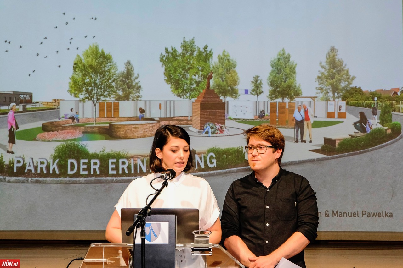 Das Siegerprojekt des Gestaltungswettbewerbs wurde in Wiener Neudorf präsentiert: Die beiden ehemaligen Studierenden der TU Wien Sara Kaurin und Manuel Pawelka, die auf die Gestaltung von öffentlichen Plätzen spezialisiert sind, begeisterten mit ihrem Konzept "Park der Erinnerung" den Gemeinderat sowie die anwesenden Jurymitglieder. Es ermöglicht die Erinnerungskultur auf sensible und zugleich moderne Art und Weise aufrechtzuerhalten. Mit der Gestaltung eines Parks mit pädagogischen Lernstationen haben sie eine Ruheinsel entworfen, die auch für Schülerführungen und Gedenkveranstaltungen gut geeignet ist, so das Urteil.