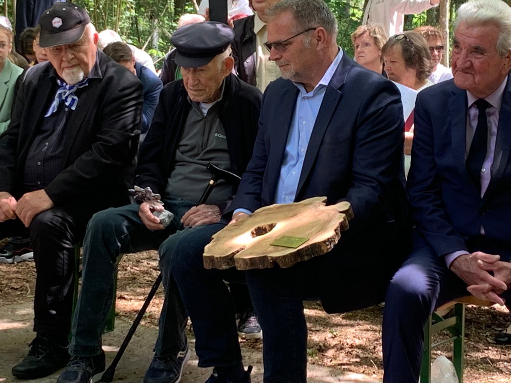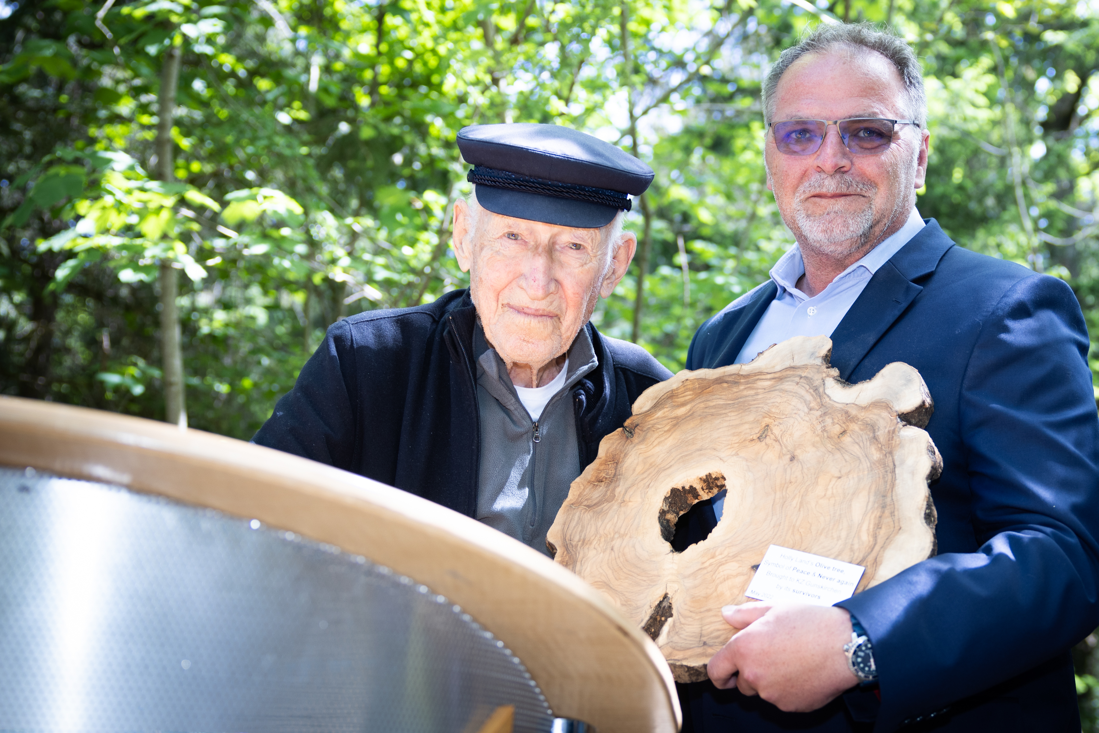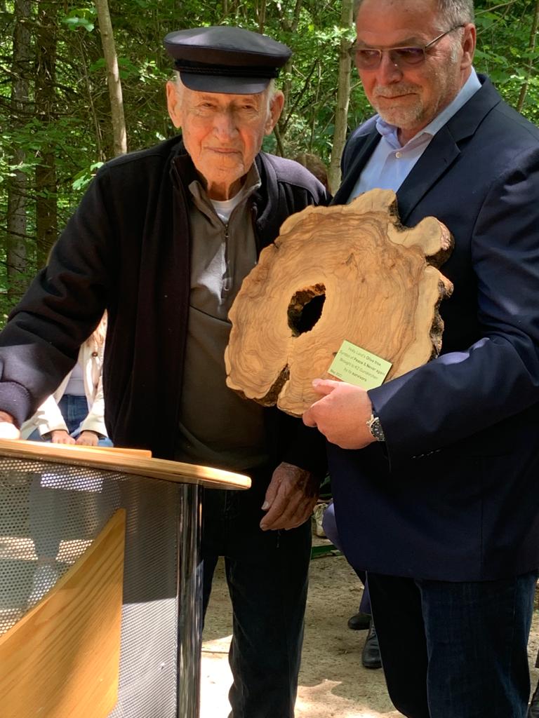 Daniel Chanoch übergab dem MKÖ-Vorsitzenden Willi Mernyi ein Relikt für den geplanten Gedenkort in Gunskirchen. Daniel Chanoch, einer der letzten Überlebenden des KZ-Außenlagers Gunskirchen, reiste trotz seiner 91 Jahre aus Israel an.